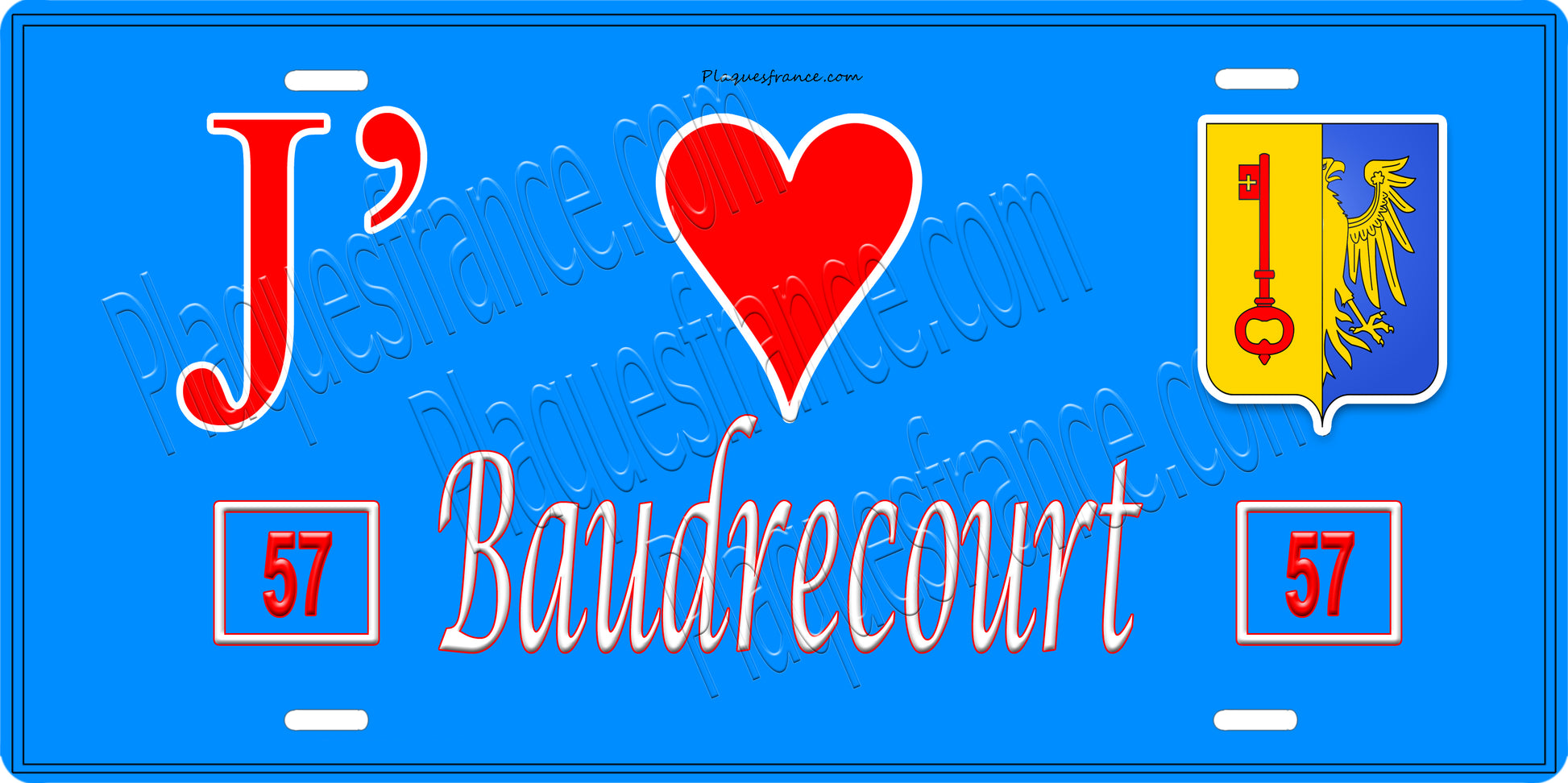 Plaque métal décorative 15 x 30 cm fond bleu 57 J' ❤️ Baudrecourt, canton du Saulnois Moselle 57