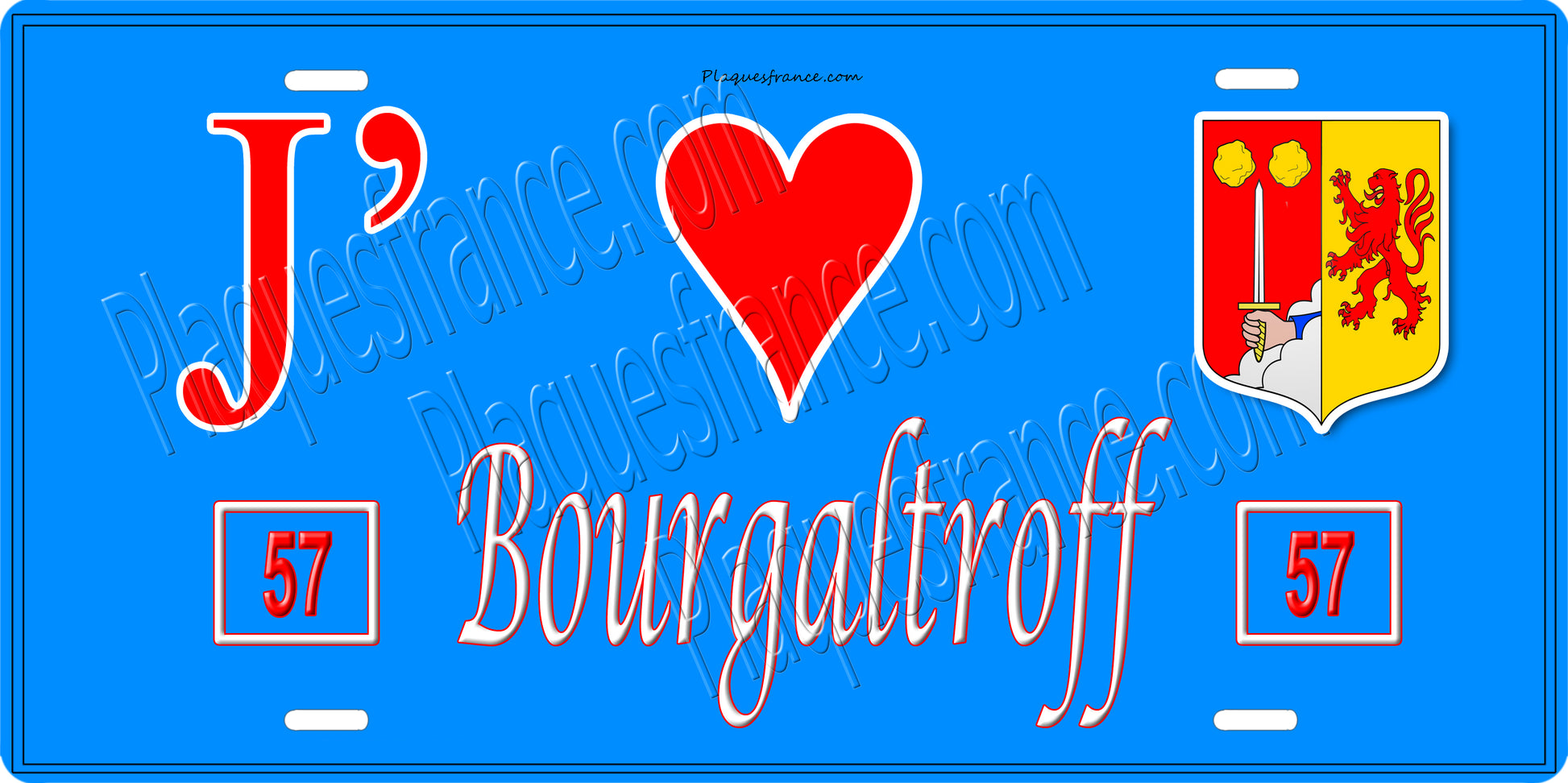 Plaque métal décorative 15 x 30 cm fond bleu 57 J' ❤️ Bourgaltroff, canton du Saulnois Moselle 57