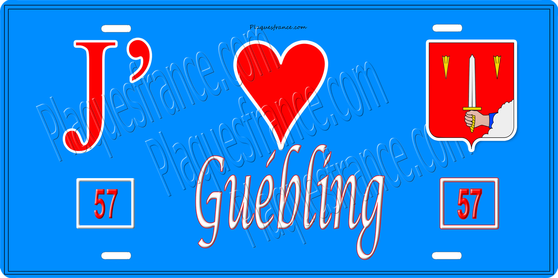 Plaque métal décorative 15 x 30 cm fond bleu 57 J' ❤️ Guebling, canton du Saulnois Moselle 57