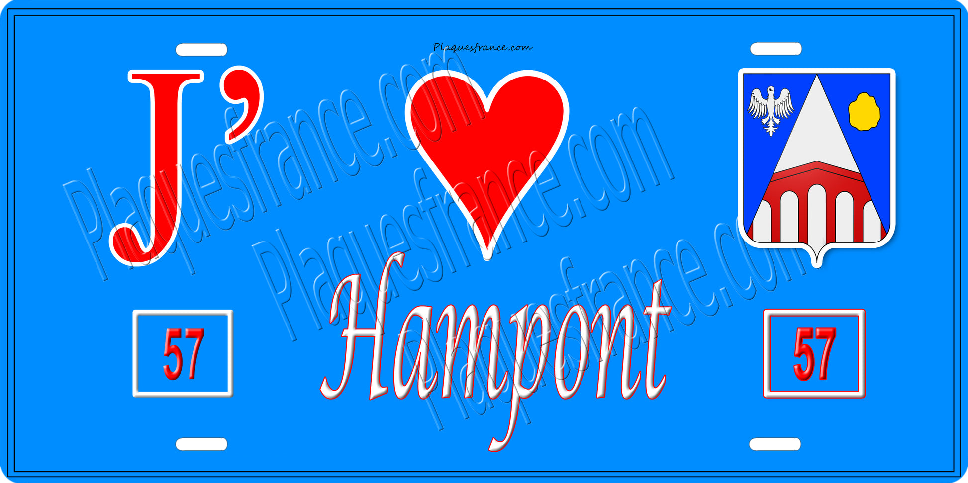 Plaque métal décorative 15 x 30 cm fond bleu 57 J' ❤️ Hampont, canton du Saulnois Moselle 57