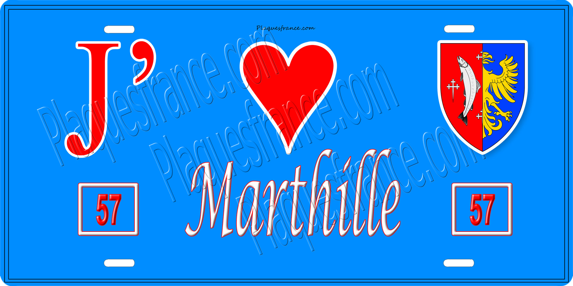 Plaque métal décorative 15 x 30 cm fond bleu 57 J' ❤️Marthille, canton du Saulnois Moselle 57