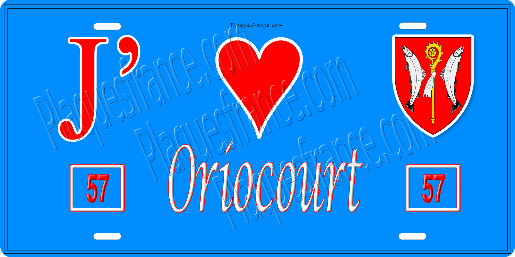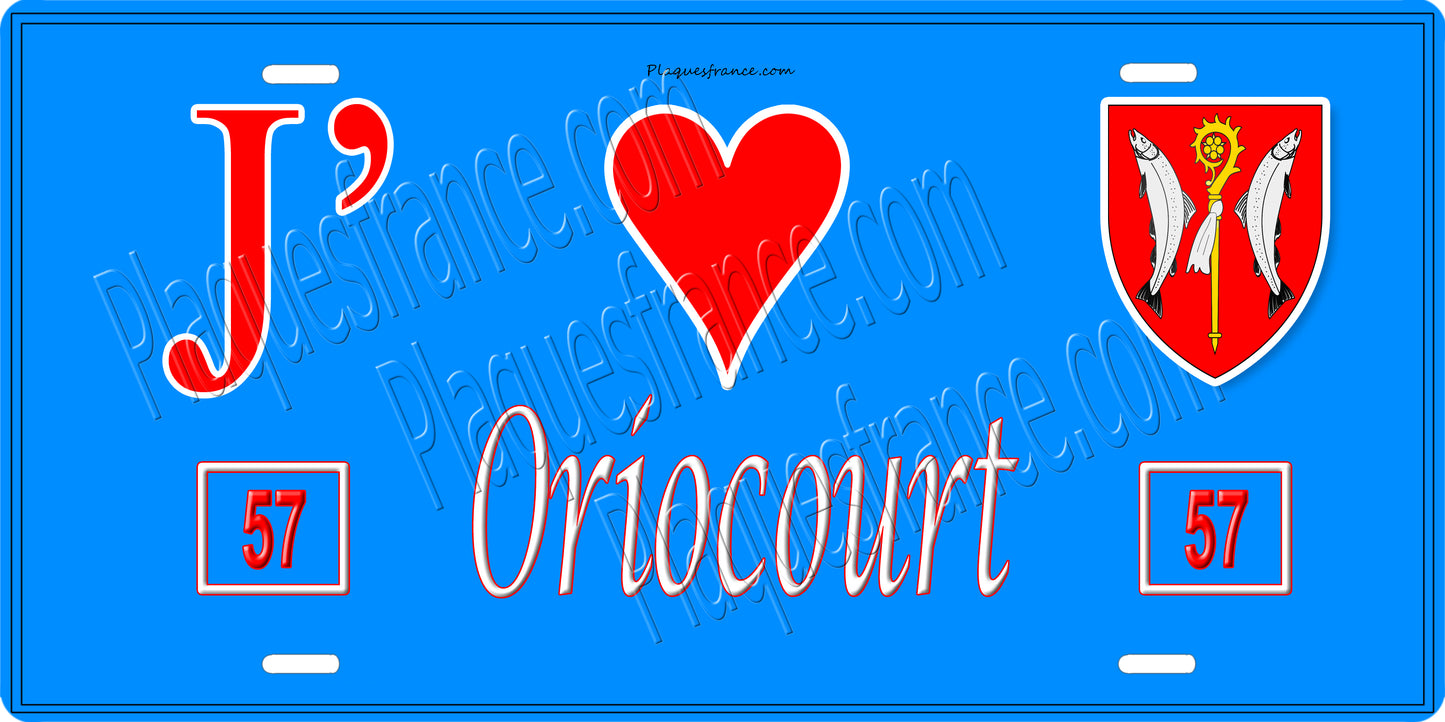 Plaque métal décorative 15 x 30 cm fond bleu 57 J' ❤️Oriocourt, canton du Saulnois Moselle 57