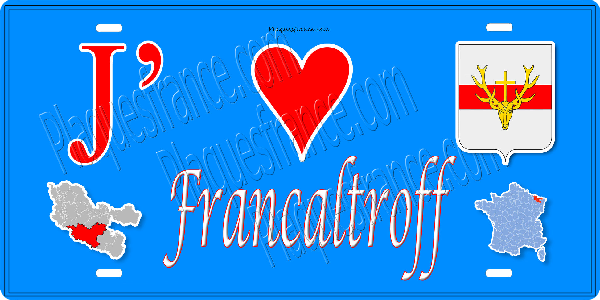 Plaque métal décorative 15 x 30 cm fond bleu carte J' ❤️ Francaltroff, canton du Saulnois Moselle 57