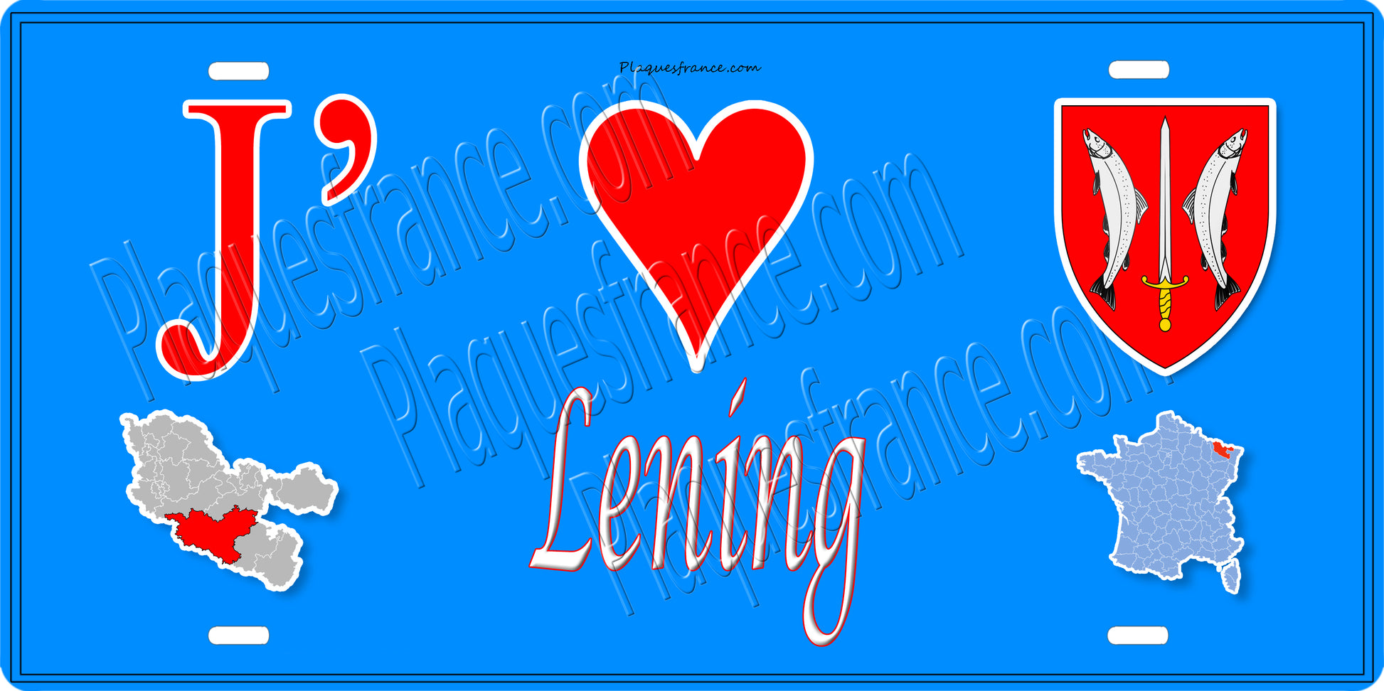 Plaque métal décorative 15 x 30 cm fond bleu carte J' ❤️ Léning, canton du Saulnois Moselle 57
