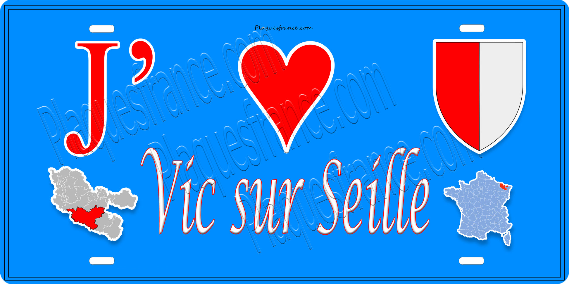 Plaque métal décorative 15 x 30 cm fond bleu carte J' ❤️ Vic-sur-Seille, canton du Saulnois Moselle 57