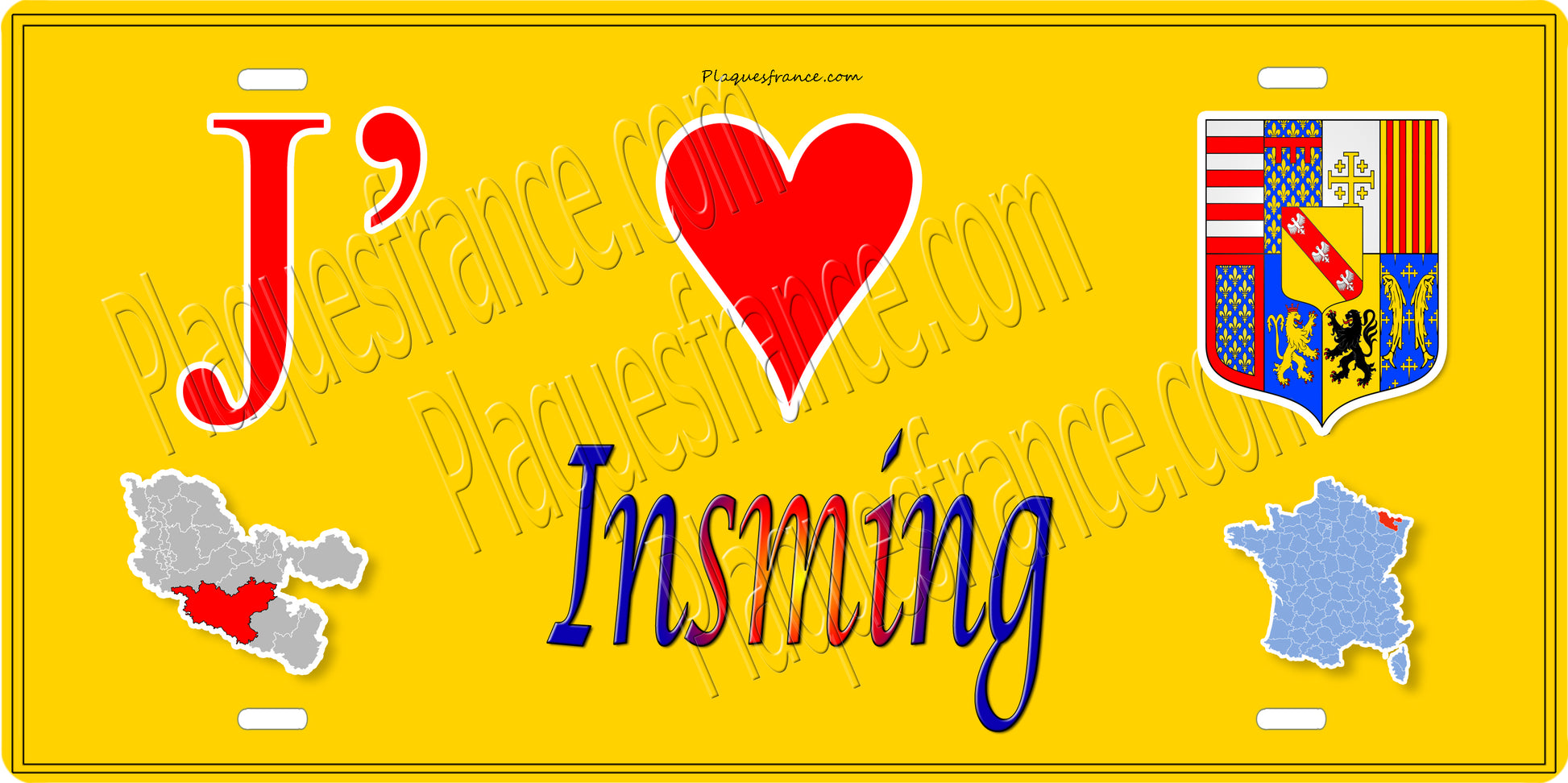 Plaque métal décorative 15 x 30 cm fond jaune carte J'❤️ Insming, canton du Saulnois Moselle 57