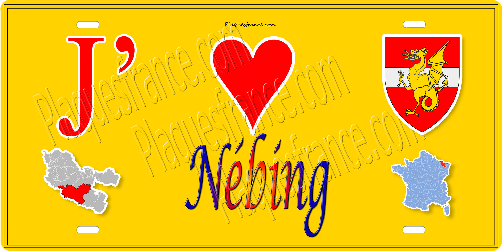 Plaque métal décorative 15 x 30 cm fond jaune carte J' ❤️ Nébing, canton du Saulnois Moselle 57