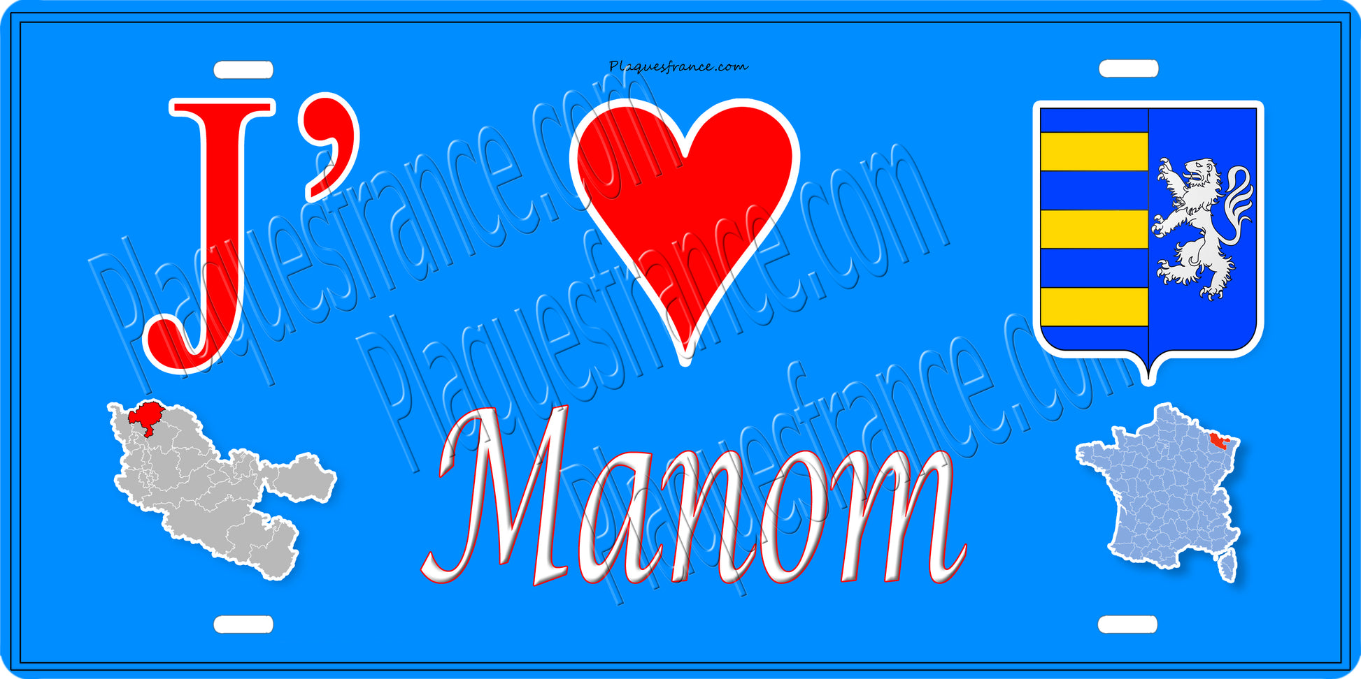 Plaque métal décorative 15 x 30 cm fond mur bleu carte J' ❤️ Manom, canton Yutz Moselle 57