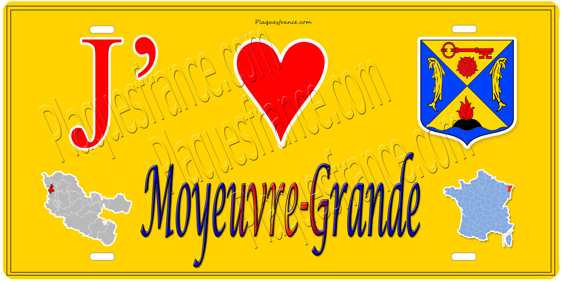 Plaque métal décorative 15 x 30 cm fond mur jaune carte J' ❤️ Moyeuvre-Grande, canton Hayange Moselle 57