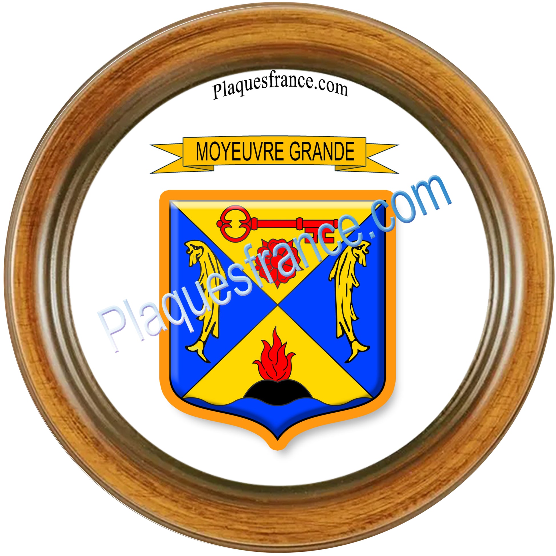 Plaque métal décorative cadre bois ronde Ø 30 cm blason Moyeuvre-Grande, canton deHayange, Moselle 57