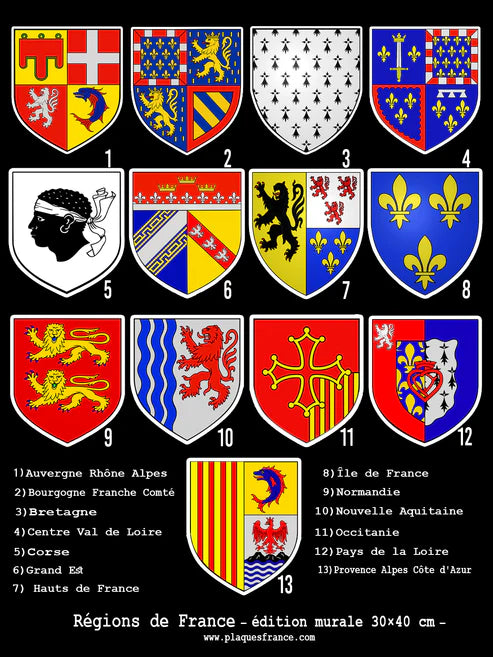 Cette composition héraldique rassemble les 13 blasons officiels des régions françaises. Chaque écusson, issu d’un héritage spécifique — royal, républicain, maritime ou montagnard — trouve sa place dans une grille équilibrée, emblème de la diversité et de l’unité du territoire national.