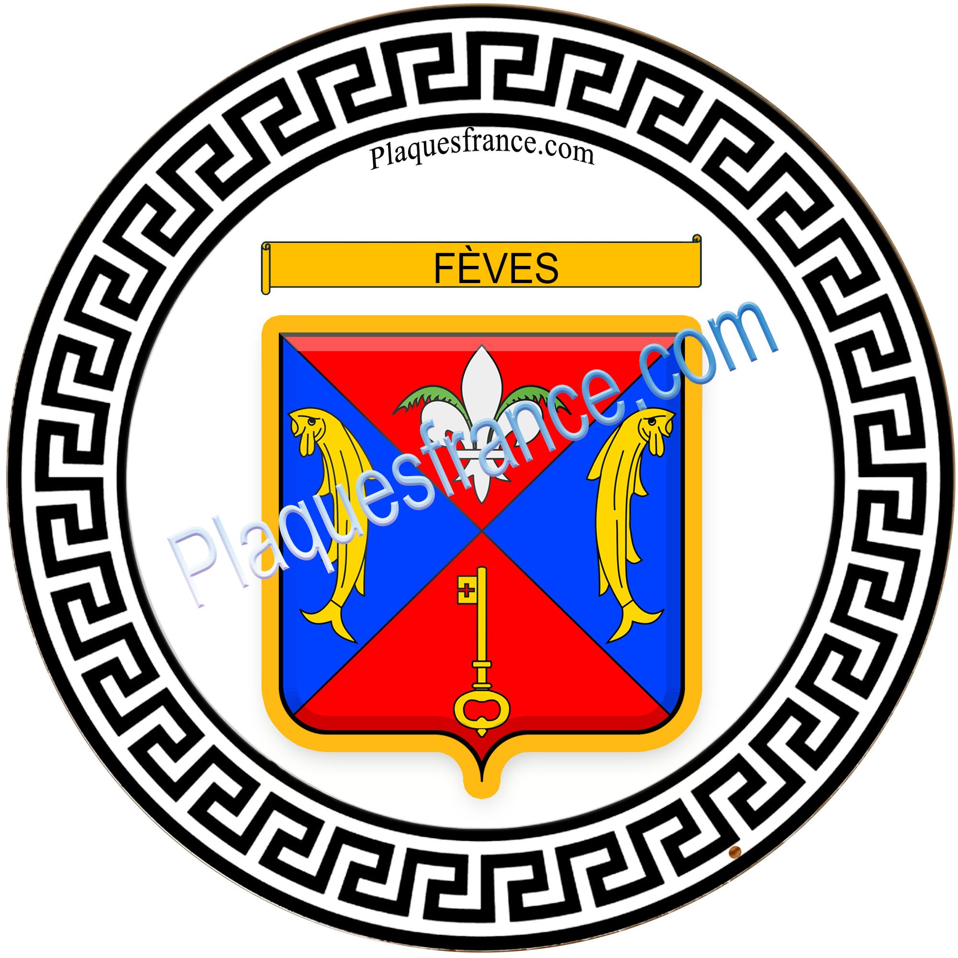 Plaque métal décorative fond noir rond Ø 30cm blason Fèves, canton Rombas 57