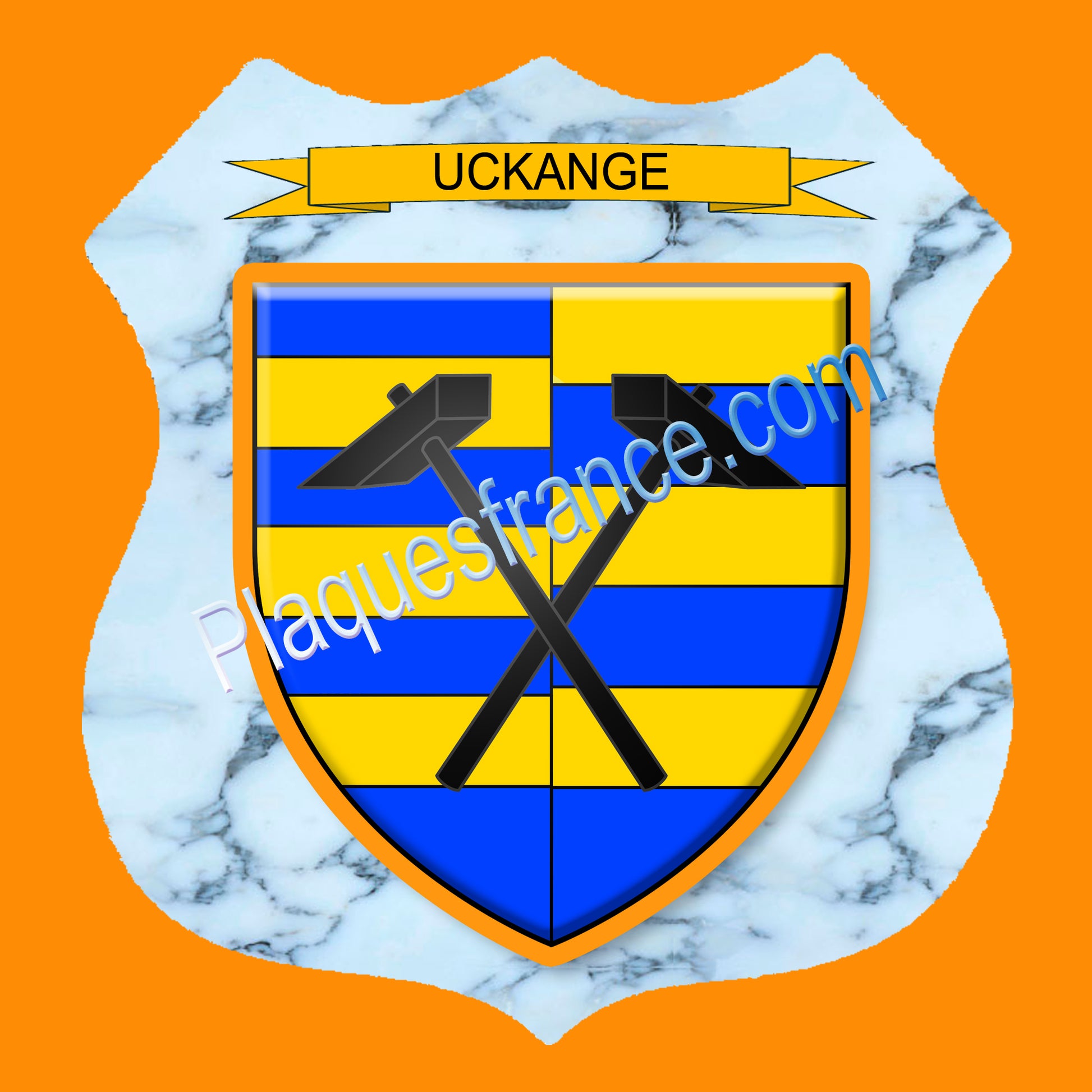 Plaque métal décorative format écusson Ø 30cm fond marbre blason Uckange, Moselle 57