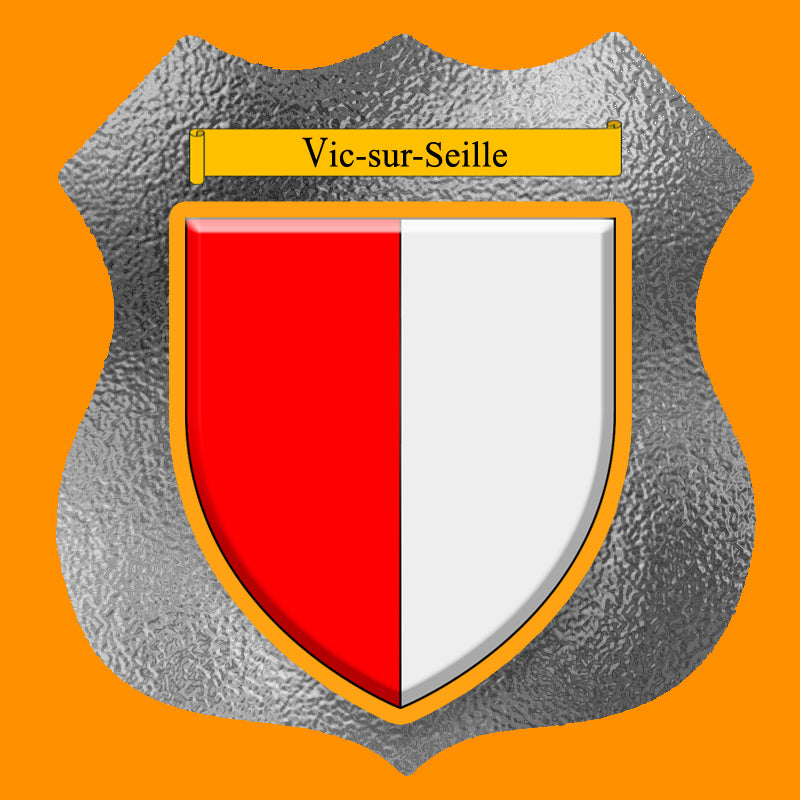 Plaque métal décorative format écusson Ø 30cm fond verre dépoli blason Vic-sur-Seille, Moselle 57