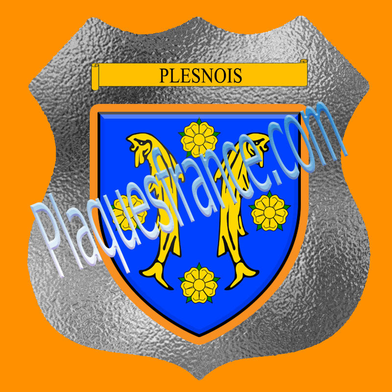 Plaque métal décorative format écusson Ø 30cm fond verre dépoli Plesnois, Moselle 57