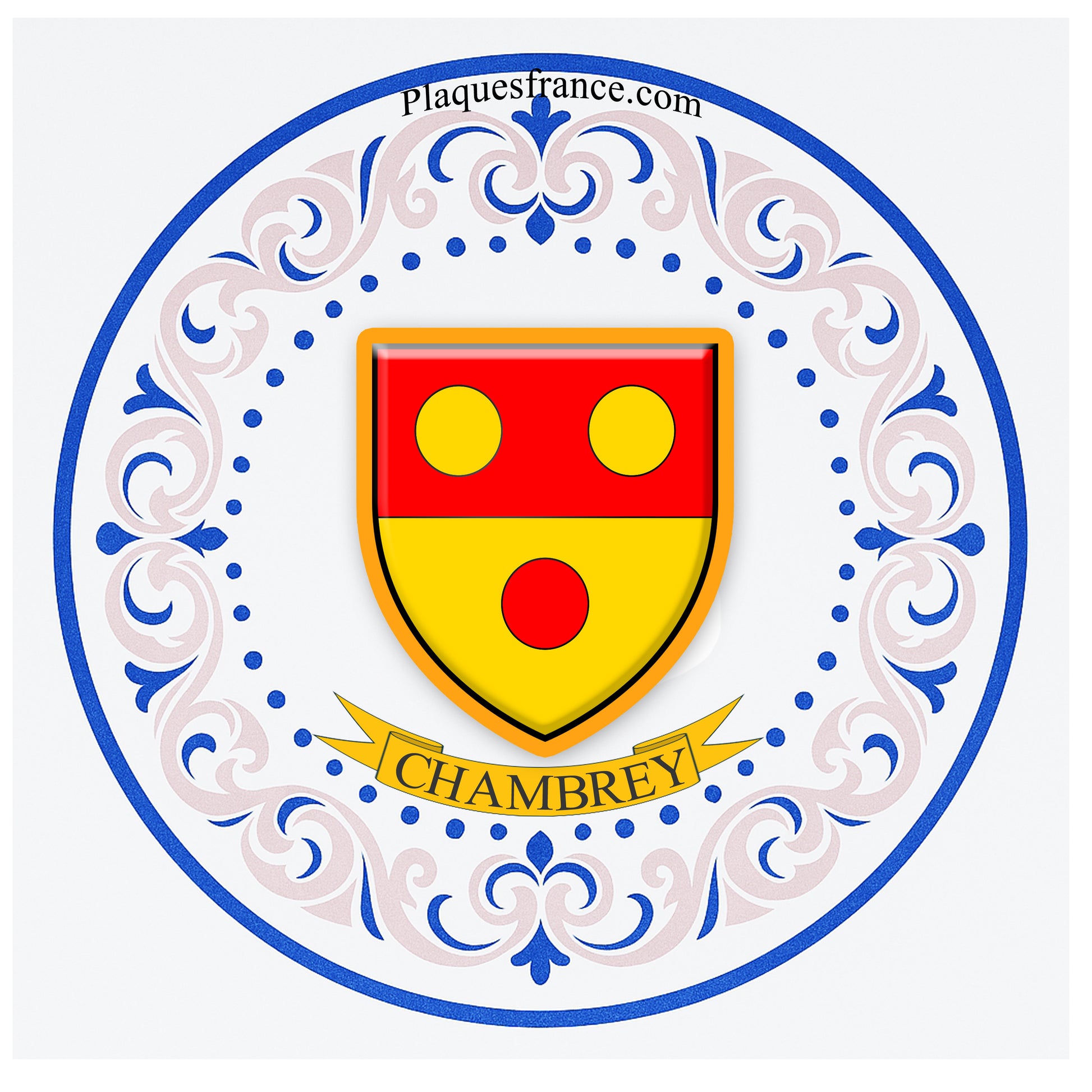 Plaque métal décorative frise lys ronde Ø 30 cm blason Chambrey, canton du Saulnois Moselle 57